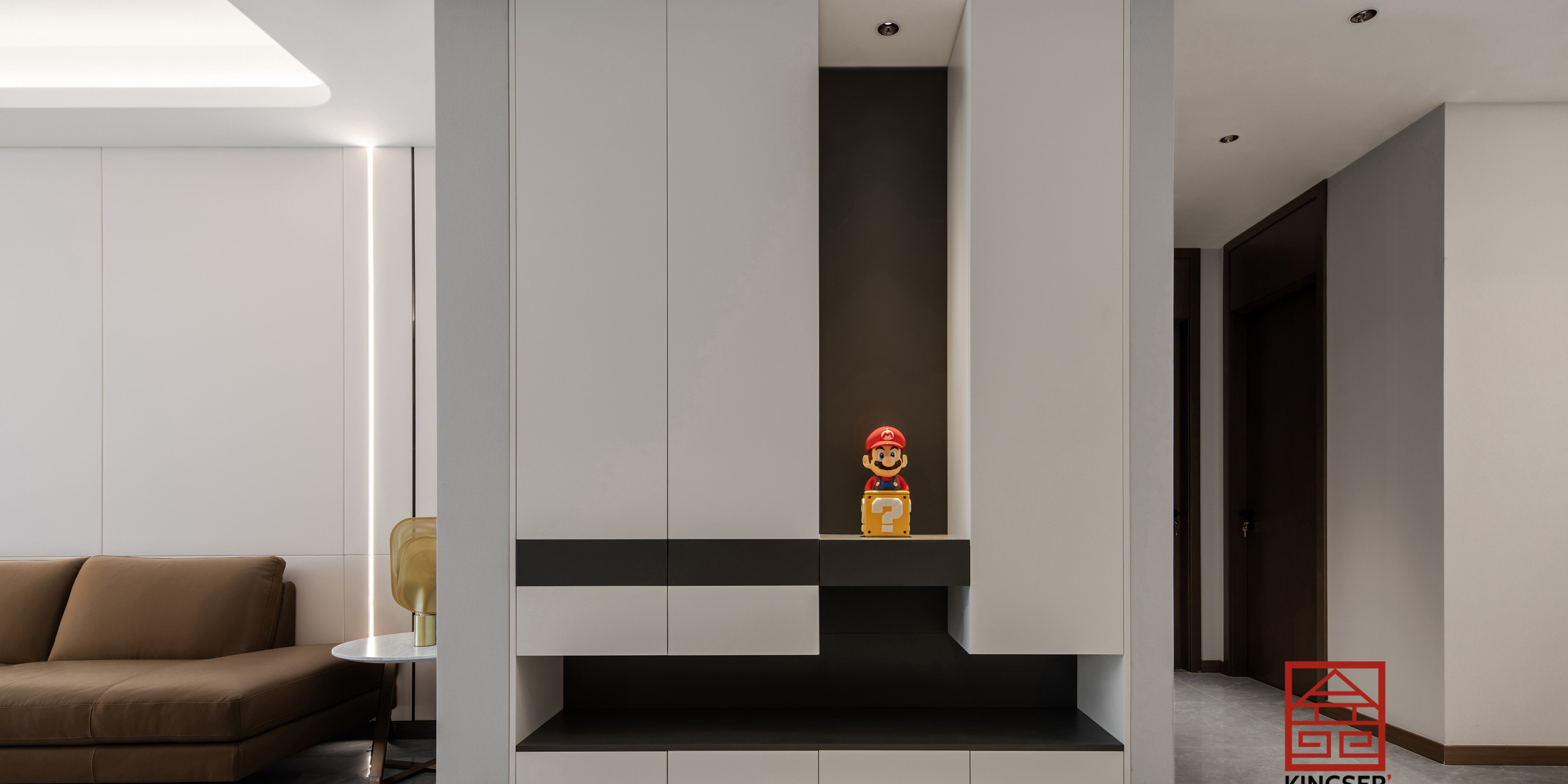 客廳采用磁吸軌道無主燈設計+定制燈帶,以舒適合理的線條,引領室內氛圍光,拉伸層高,擴充格局,讓業主真正感受私人訂制設計之美。